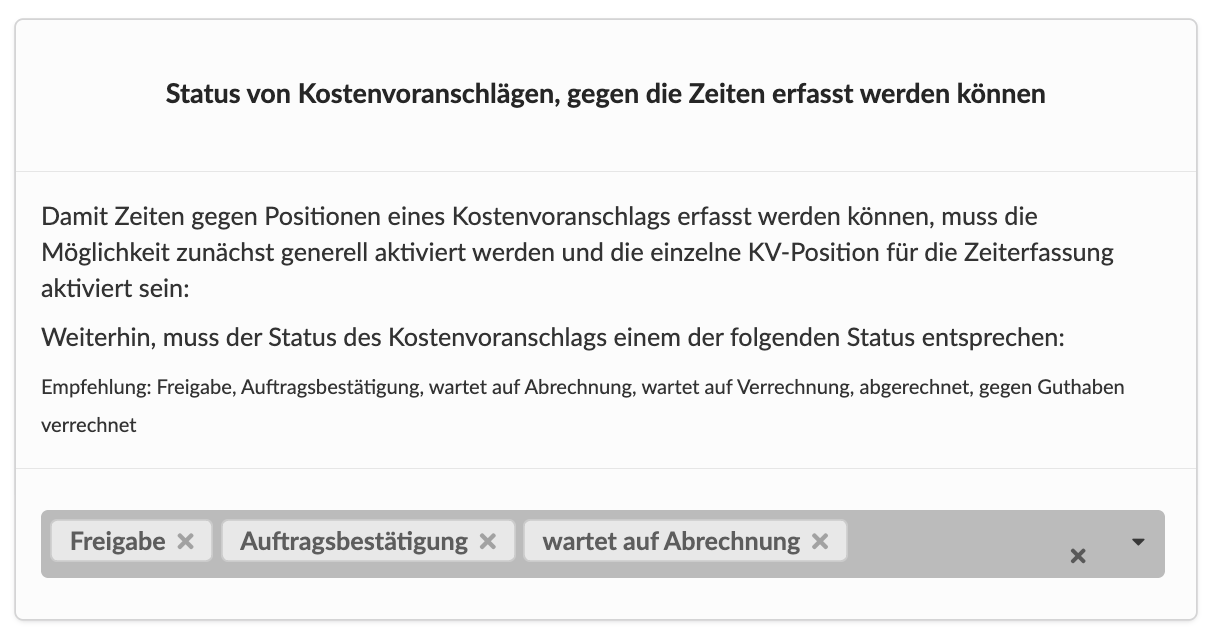 * Ist der Kostenvoranschlags-Status in der Liste enthalten, die unter Einstellungen > Finanzen > Kostenvoranschlag für die Zeiterfassung zulässig ist?