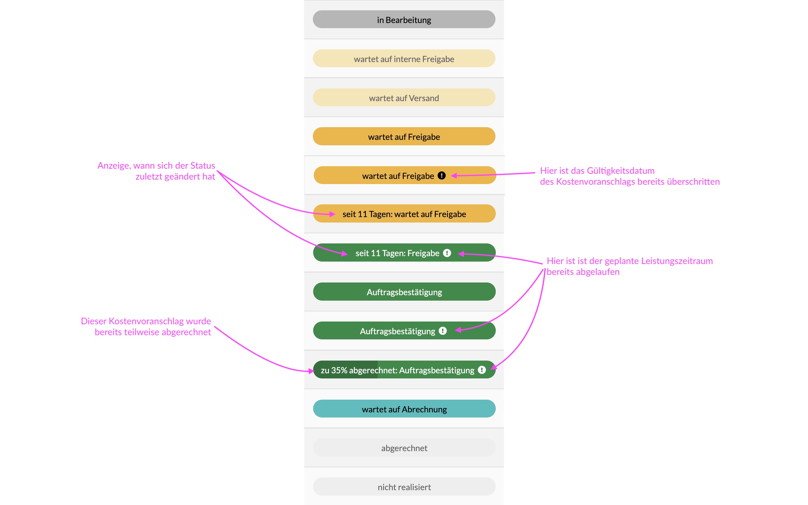 In der Liste der Kostenvoranschläge kann auf einen Blick erkannt werden, in welchem Status sich ein Dokument befindet: