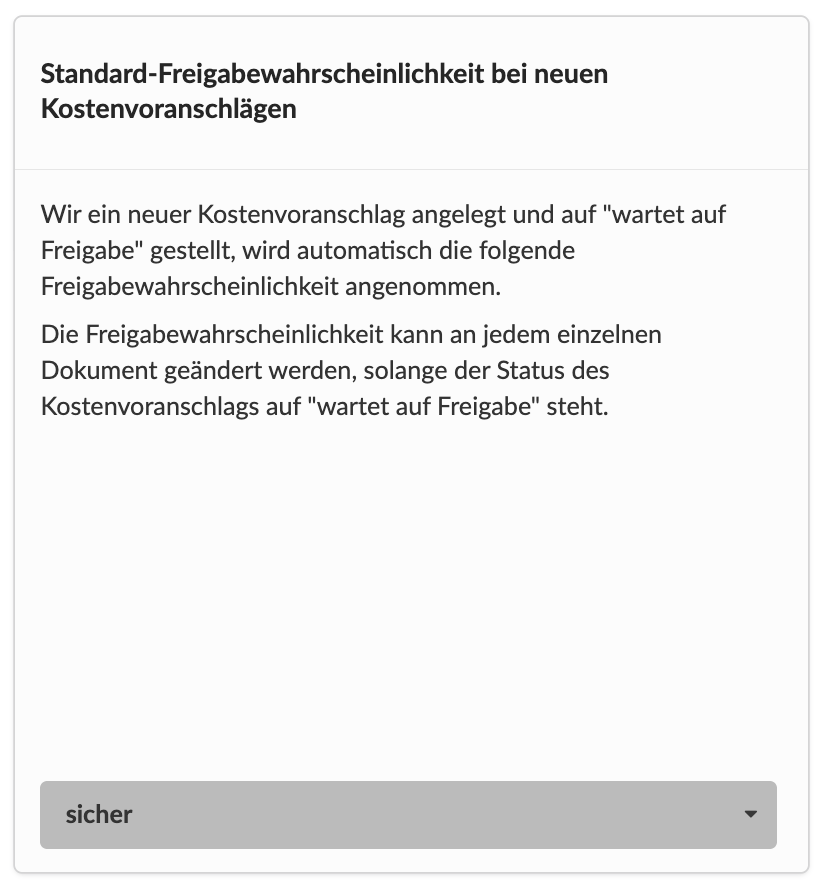 In Einstellungen > Finanzen > Kostenvoranschlag kann auch eingestellt werden, wie die Freigabe-Wahrscheinlichkeit standardmässig beim Erstellen eines neuen Dokuments voreingestellt sein soll.
